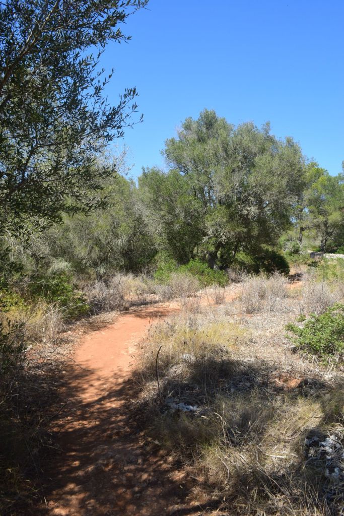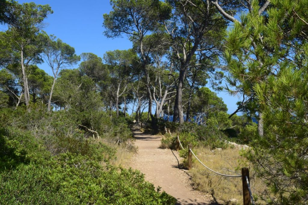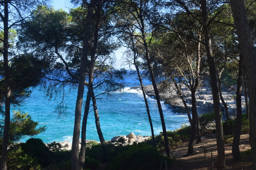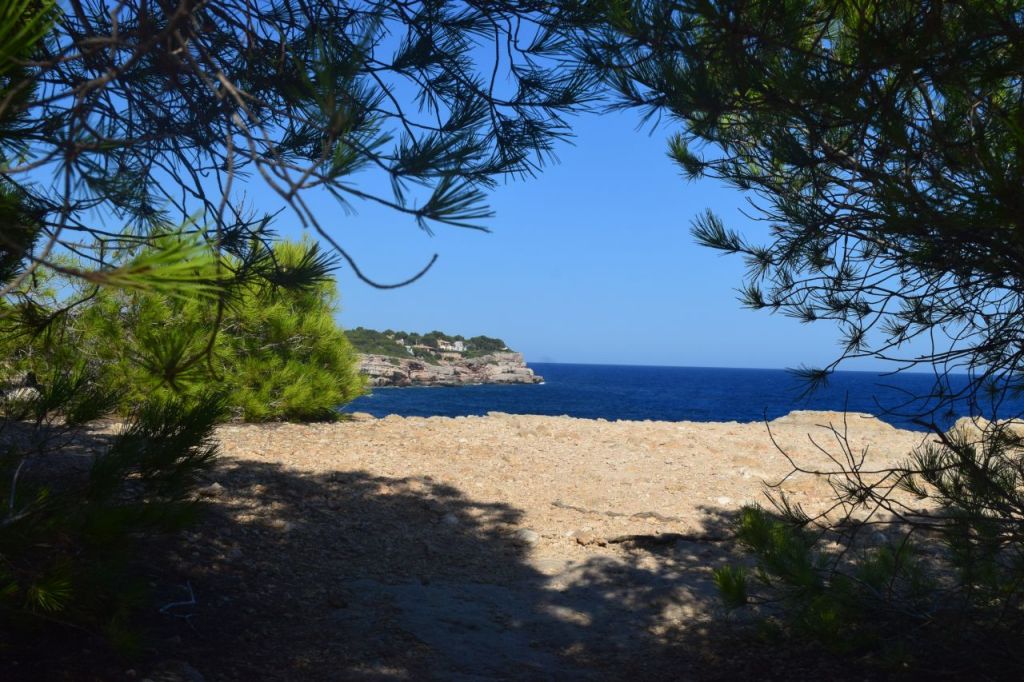 Wir finden diese am linken Rand der schönen Bucht, wo sich der Weg am Rand der Klippen in einen Pinienwald erstreckt. Hier ist es deutlich kühler und angenehmer. Entspannt steigen wir die paar Höhenmeter hinauf. Der Weg ist überall klar ausgeschildert. Festes Schuhwerk sollten man allerdings tragen.