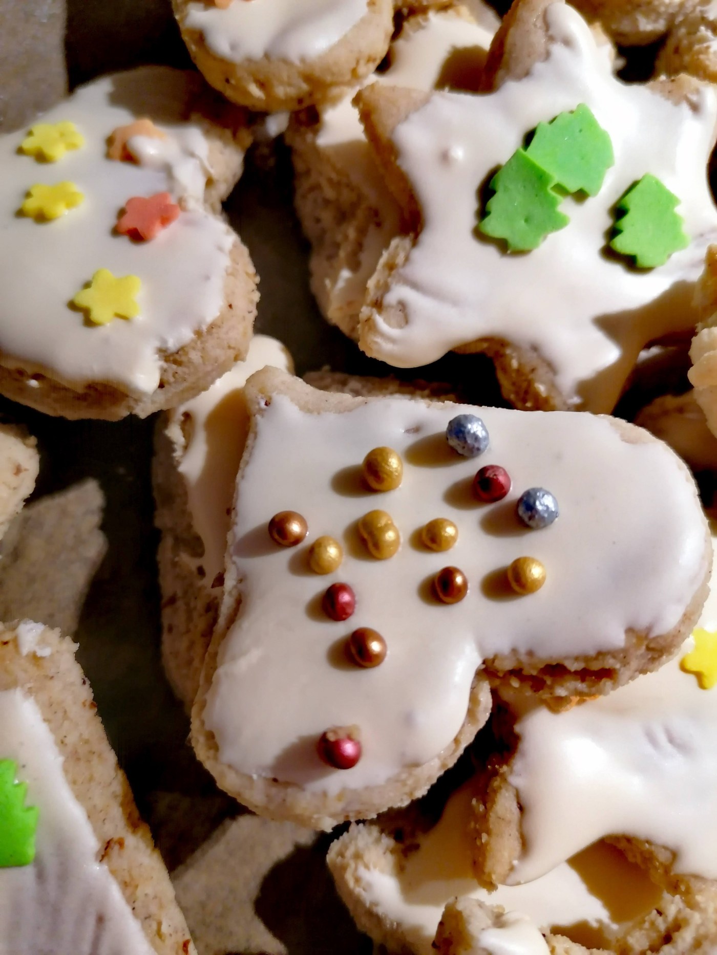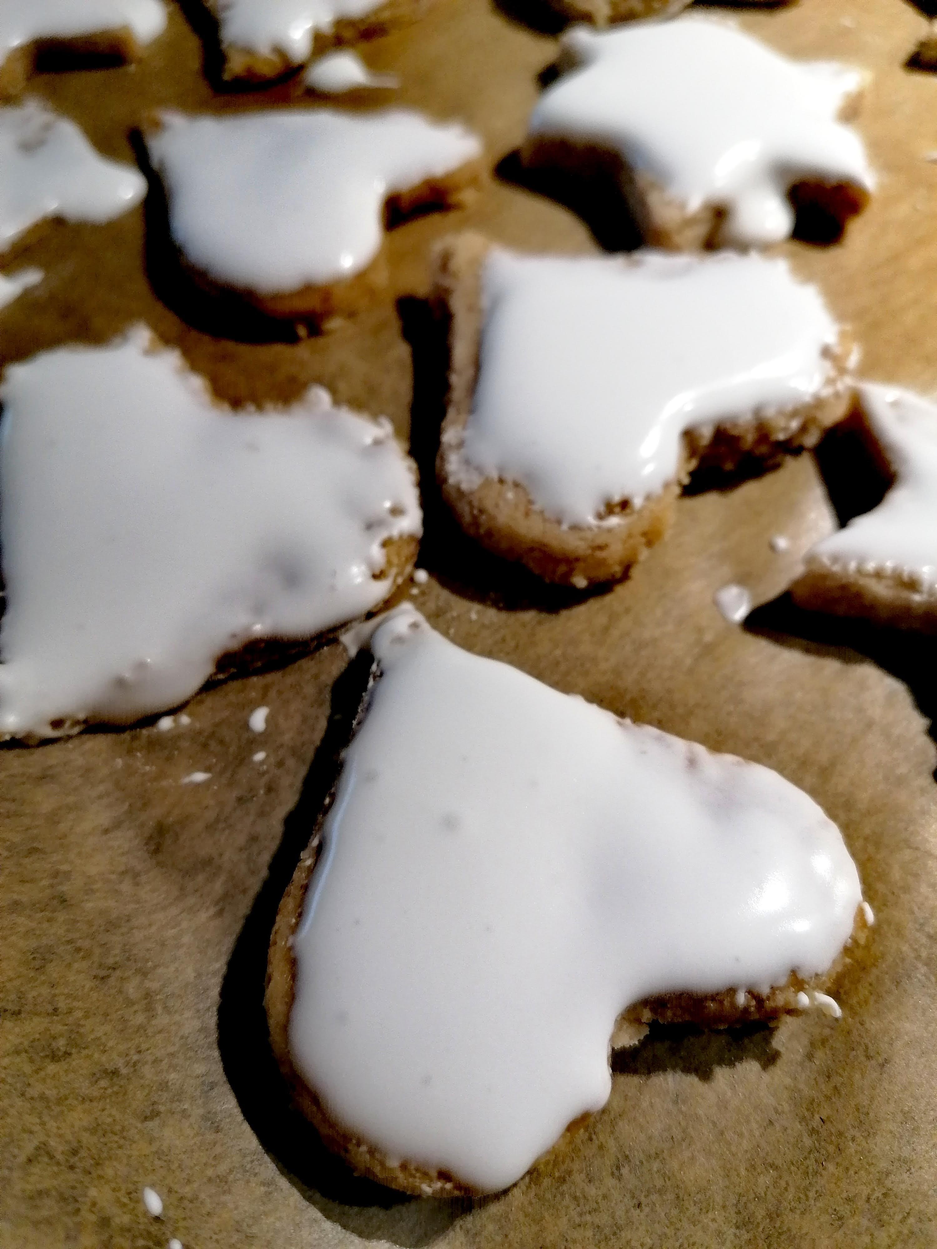 Nun die Plätzchen mit der fertigen Glasur mit einem Silikonpinsel bestreichen und nach Belieben verzieren.