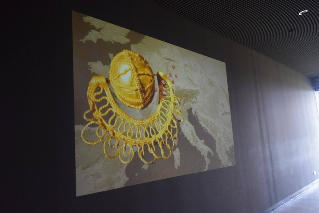 Was uns hier auch sehr gut gefallen hat, ist die angewandte Museumspädagogik. Um sich bspw. die Lage der Exponate in den Gräbern vorstellen zu können, sind diese vor den Schaukästen auf den Boden projieziert. Es gibt einige versteckte Schubladen (achtet unbedingt auf rote Streifen unter den Schaukästen – hier verstecken sich nämlich Zusatzinformationen). Unser Favorit ist ein großer interaktiver und drehbarer Fernseher, der in Richtung der großen Panoramascheibe ausgerichtet ist – hier kann man sowohl interessante Fakten über die Vergangenheit und die archäologischen Funde als auch über die Gegenwart erfahren. Das Museum ist sowohl für Kinder geeignet, aber auch als Erwachsener hat man hier richtig Spaß und Freude daran in die Geschichte der Kelten einzutauchen.