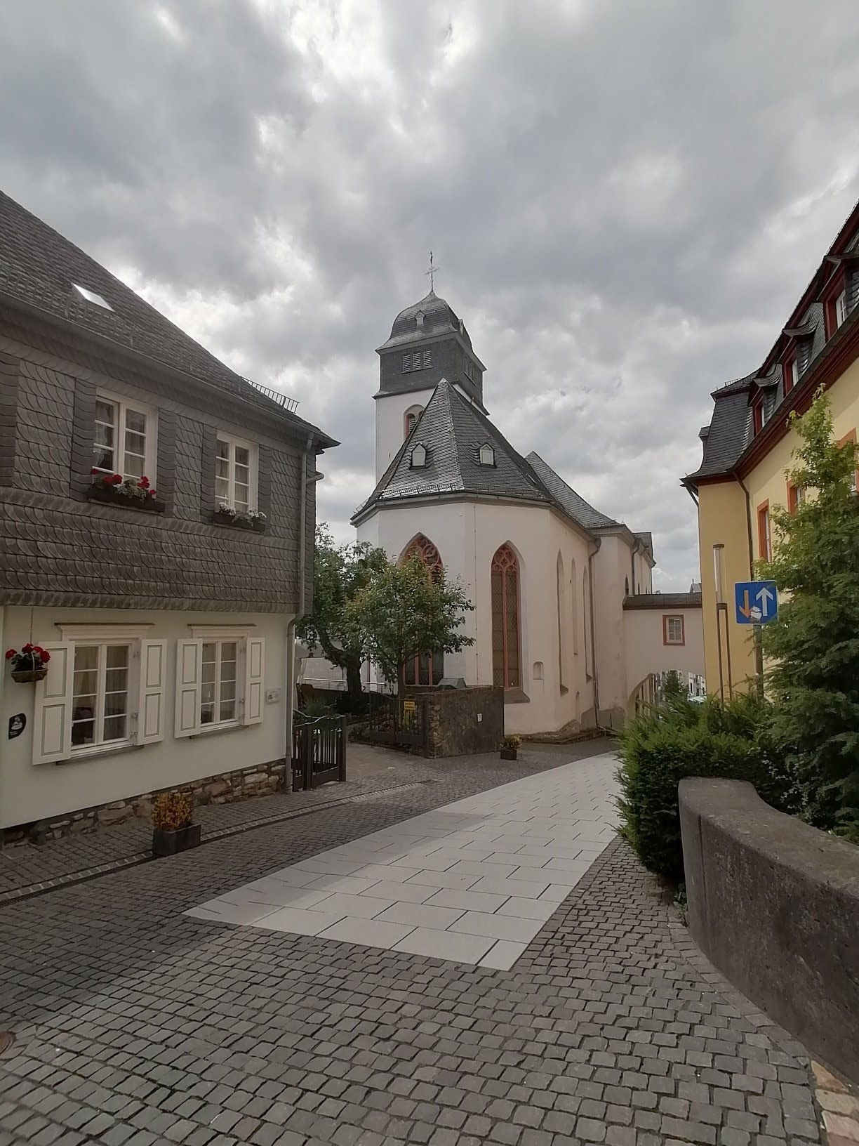 Vom Schloss Hachenburg führt ein Verbindungsgang zur evangelischen Schlosskirche am Alten Markt. Die Kirche trägt auch den Name St. Katharinen Kirche.