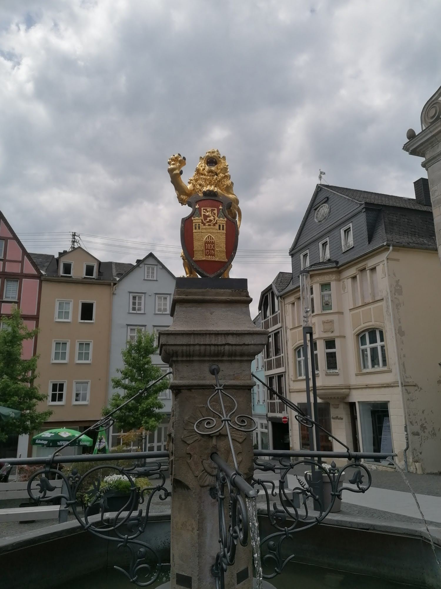 Ein doppelschweifiger Löwe ziert den Löwenbrunnen und wacht über das Stadtwappen von Hachenburg, welches sich zwischen seinen Tatzen befindet. Der Brunnen mit seiner Statue brachte der Stadt den Kosename „Löwenstadt“ ein.