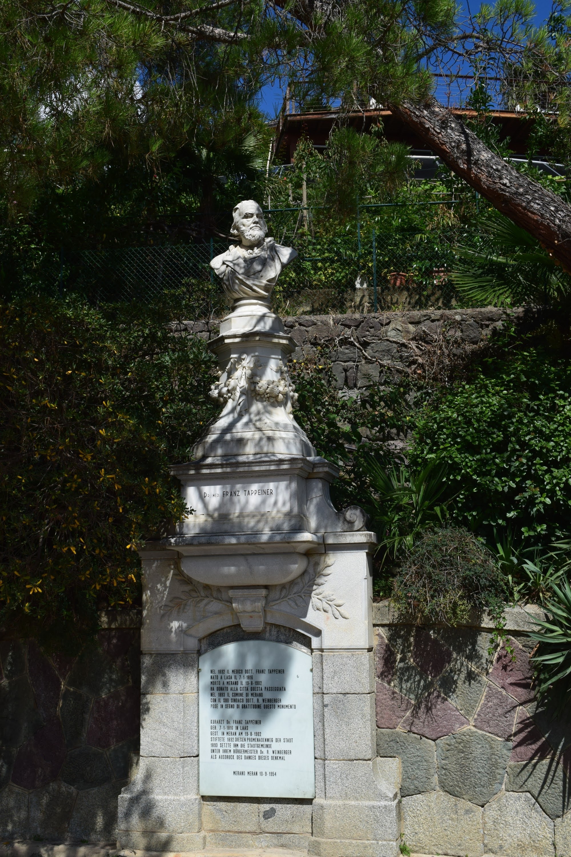 Denkmal von Dr. med. Tappeiner: Unterwegs erfährt man natürlich auch, wer dieser Herr Tappeiner ist. Franz Tappeiner (geb. 1816 in Laas, verstorben 1902 in Meran) war Kurarzt, Anthropologe und Botaniker. 1832 stiftete er der Stadt diesen Weg.